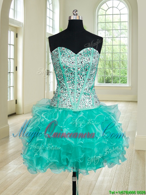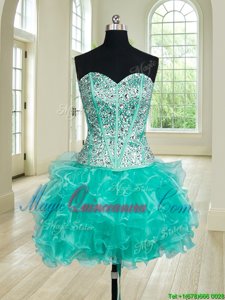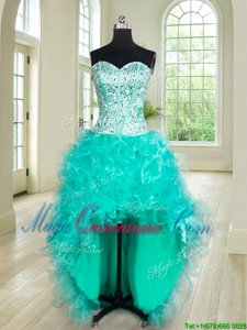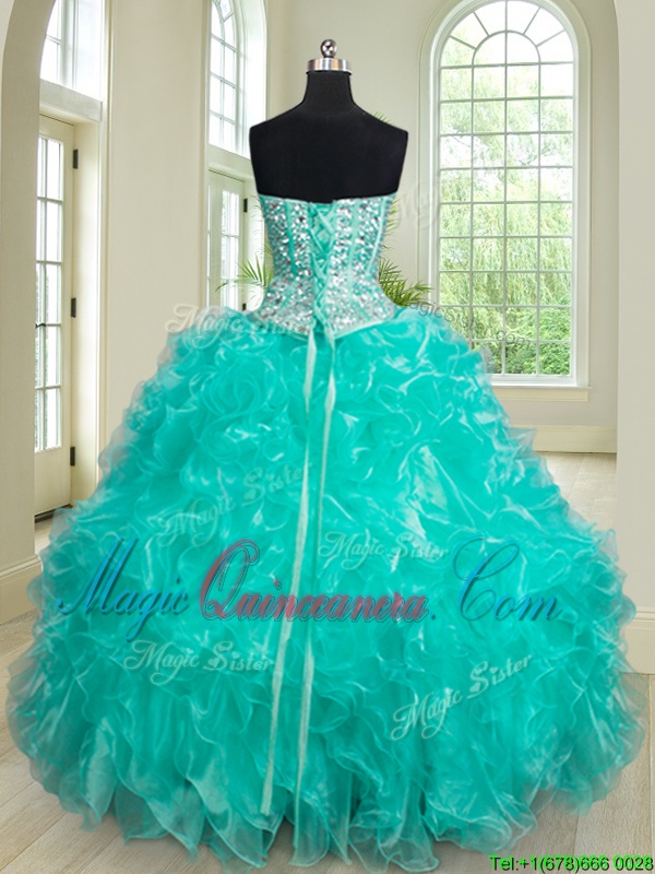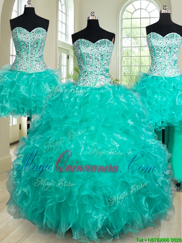 , Fantastic Four Piece Floor Length Turquoise Quinceanera Dresses Organza Sleeveless Beading and Ruffles