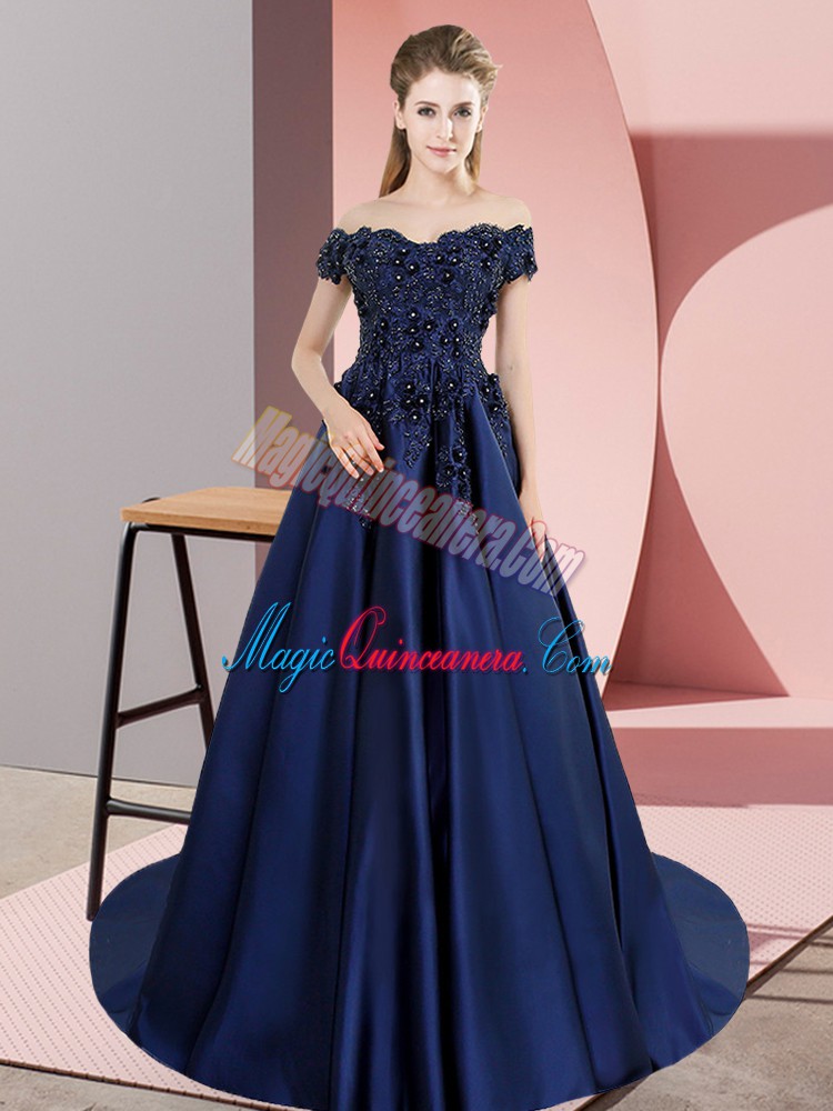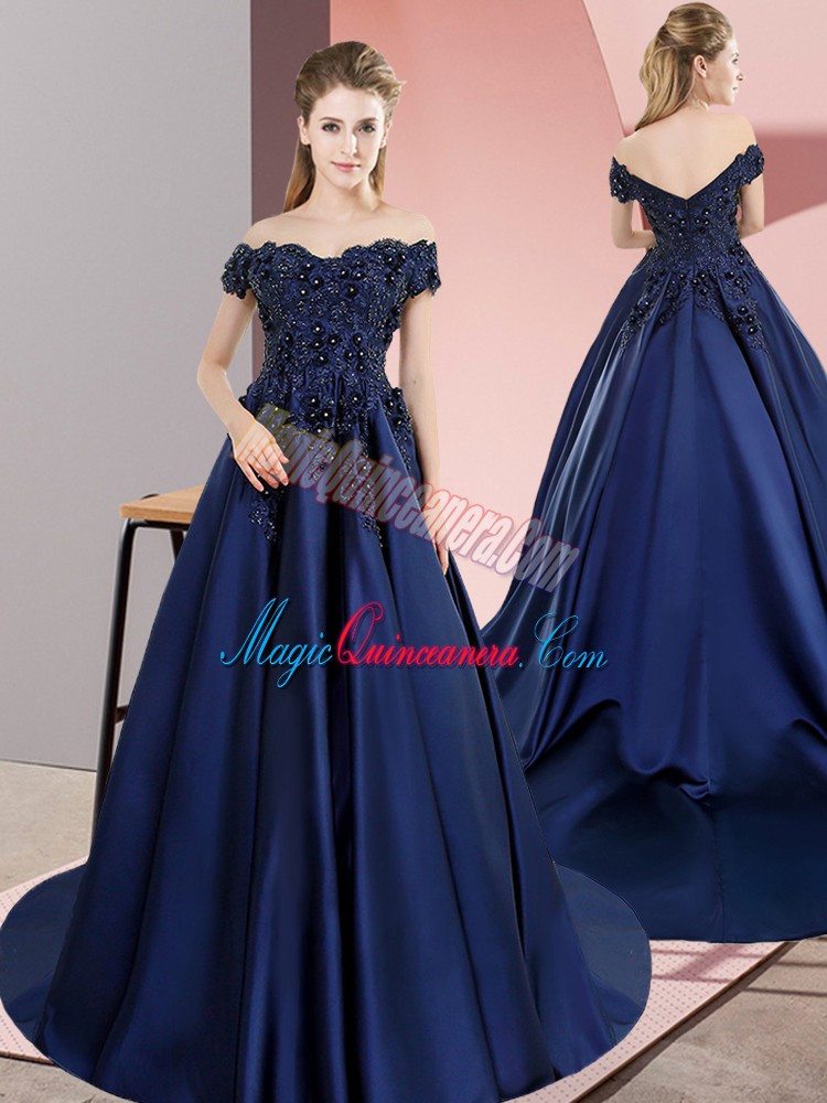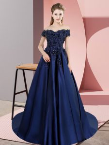 , Fantastic Navy Blue A-line Lace Quinceanera Gowns Lace Up Satin Sleeveless