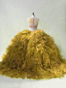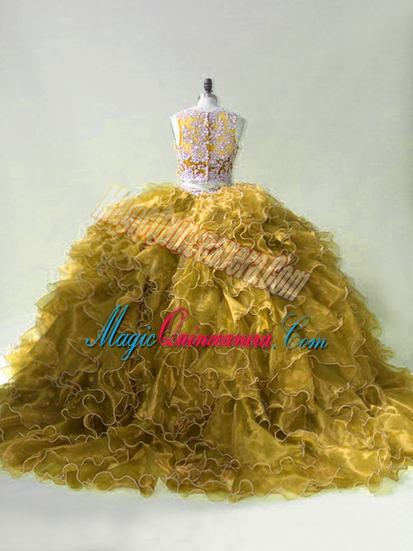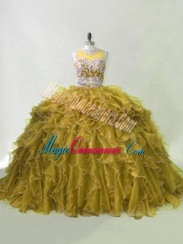 Fantastic Scoop Sleeveless Sweet 16 Dresses Brush Train Beading and Ruffles Olive Green Organza