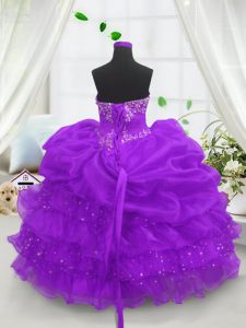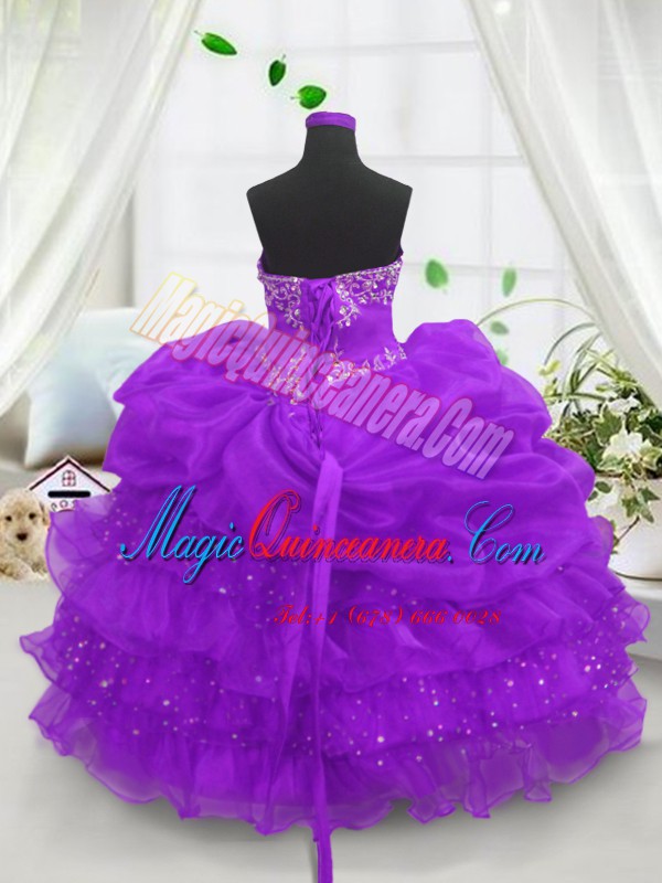 Fantastic Sleeveless Floor Length Beading and Ruffled Layers and Pick Ups Lace Up Pageant Dress for Girls with Purple