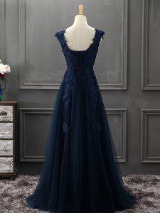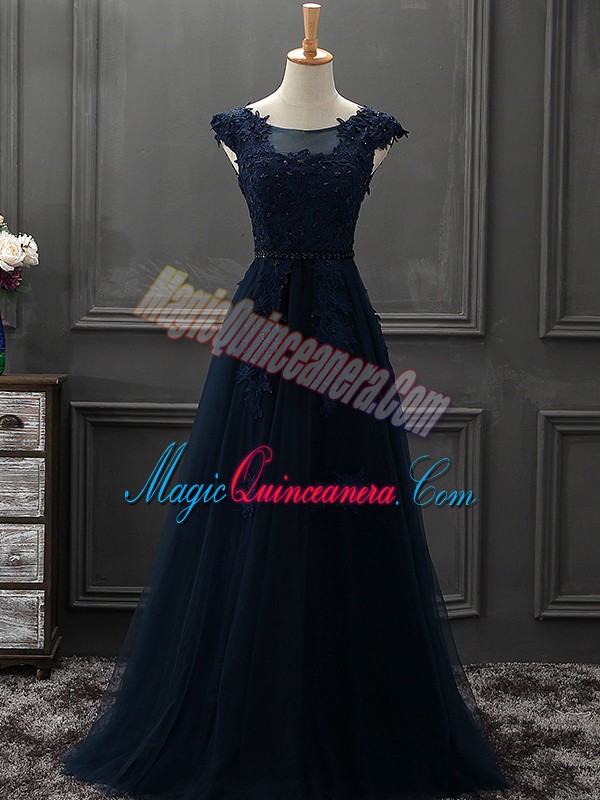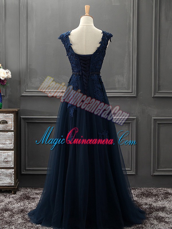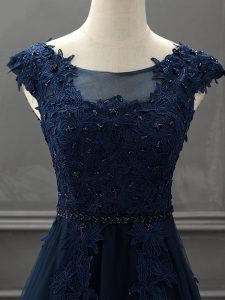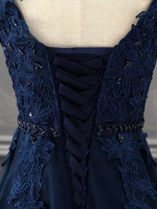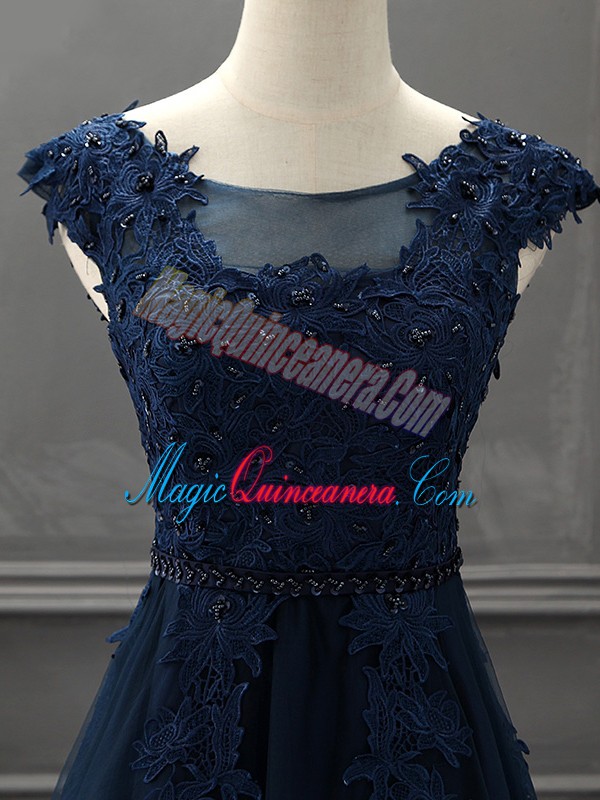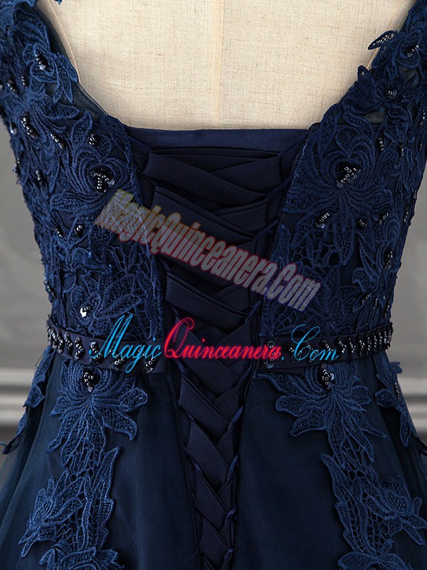 Fantastic Sleeveless Tulle Mini Length Lace Up Mother of Groom Dress in Navy Blue with Beading and Lace and Appliques