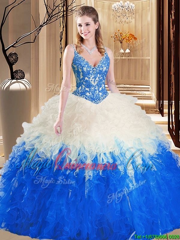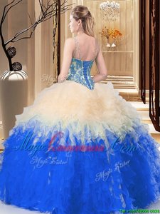 Blue Backless High-neck Embroidery and Ruffles Quinceanera Dress Organza Sleeveless Court Train