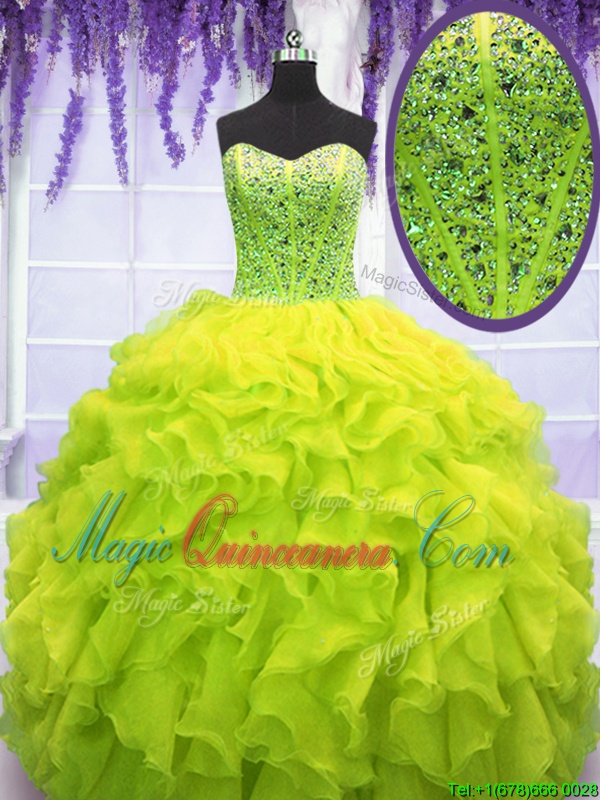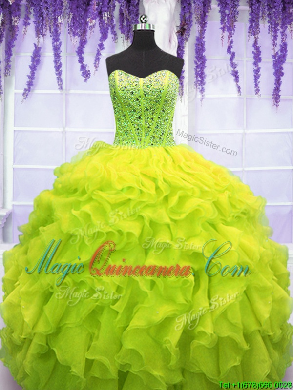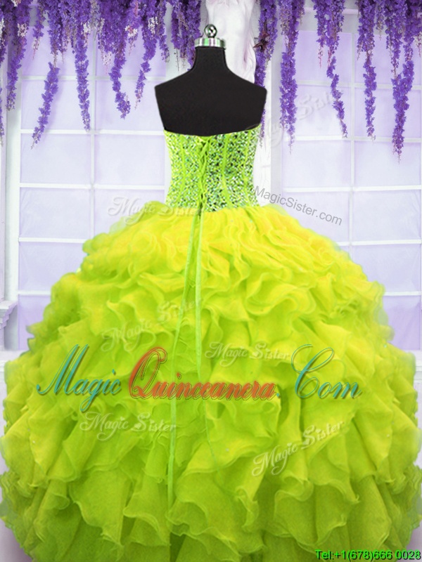 Fashion Floor Length Lace Up Ball Gown Prom Dress Yellow Green and In for Military Ball and Sweet 16 and Quinceanera with Beading and Ruffles
