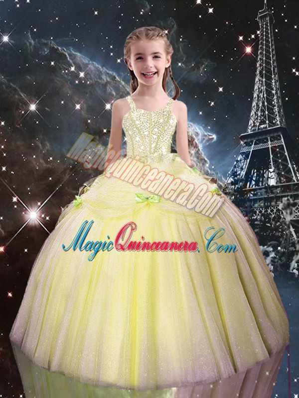 Fashion Light Yellow Sleeveless Tulle Lace Up Kids Pageant Dress for Quinceanera and Wedding Party