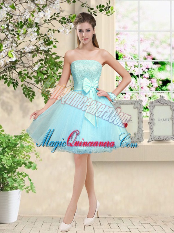 Fashion Organza Off The Shoulder Sleeveless Lace Up Lace and Belt Dama Dress in Aqua Blue