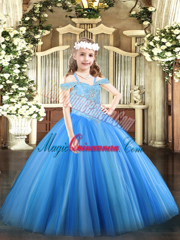 Fashion Tulle Off The Shoulder Sleeveless Lace Up Beading Pageant Dresses in Baby Blue
