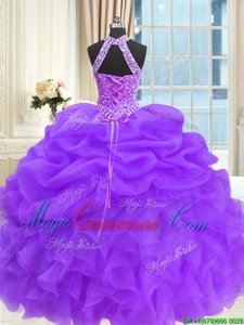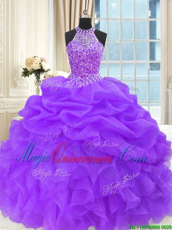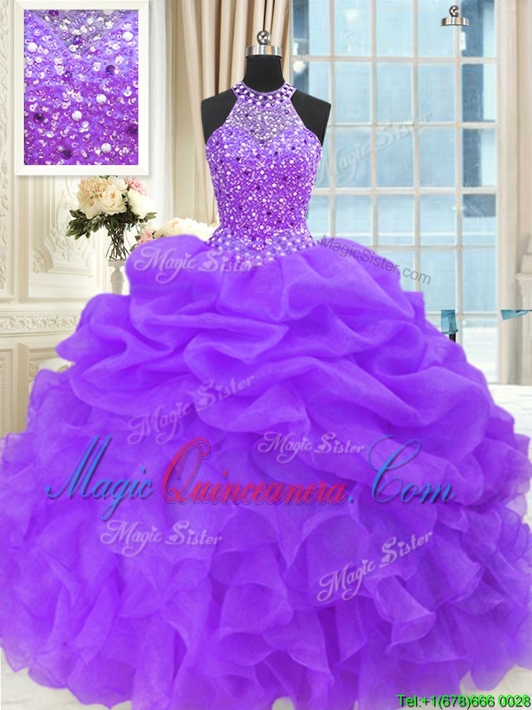 Fashionable Purple Ball Gowns Organza High-neck Sleeveless Beading and Pick Ups Floor Length Lace Up 15 Quinceanera Dress