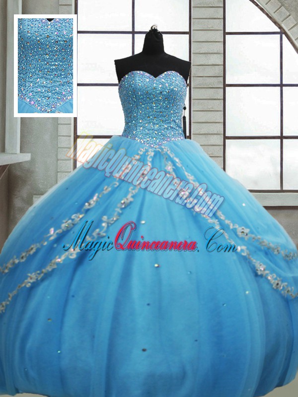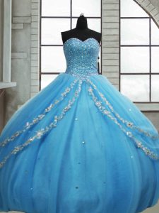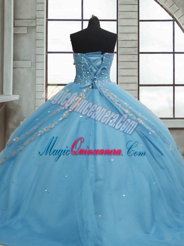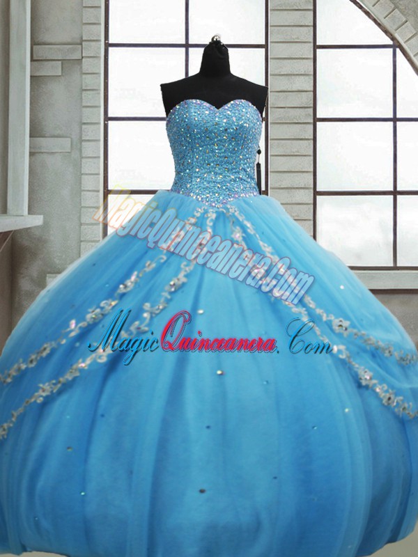 Fashionable Sleeveless Tulle Floor Length Lace Up Sweet 16 Dress in Baby Blue with Beading and Appliques and Sequins