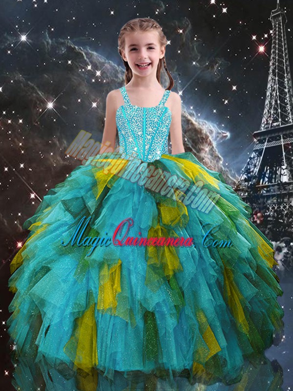 Fashionable Tulle Straps Short Sleeves Lace Up Beading and Ruffles High School Pageant Dress in Aqua Blue