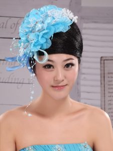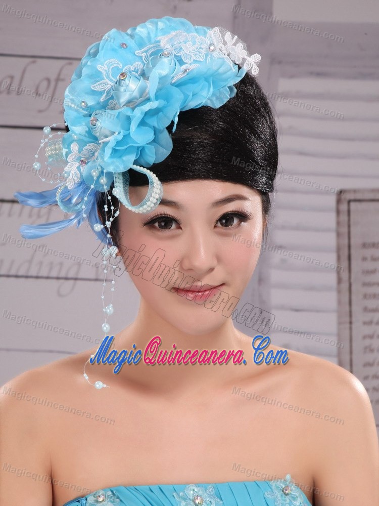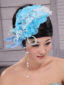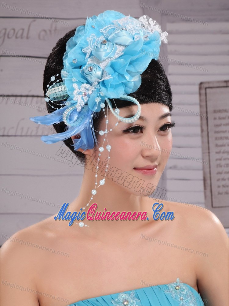 Feather Custom Made Aqua Blue Headpices With Imitation Pearls and Flowers Decorate