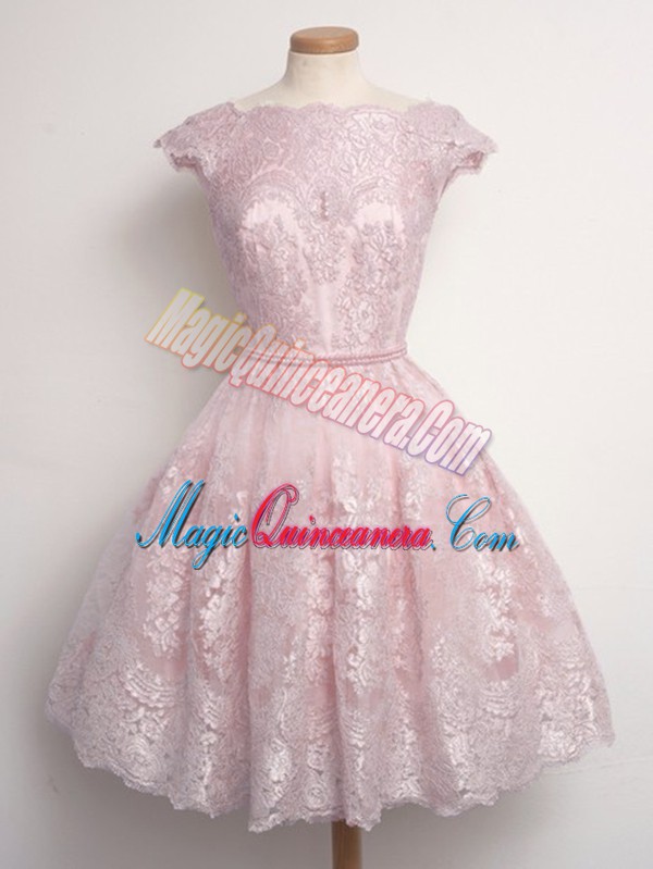 Fine A-line Quinceanera Dama Dress Baby Pink Scalloped Lace Cap Sleeves Knee Length Lace Up