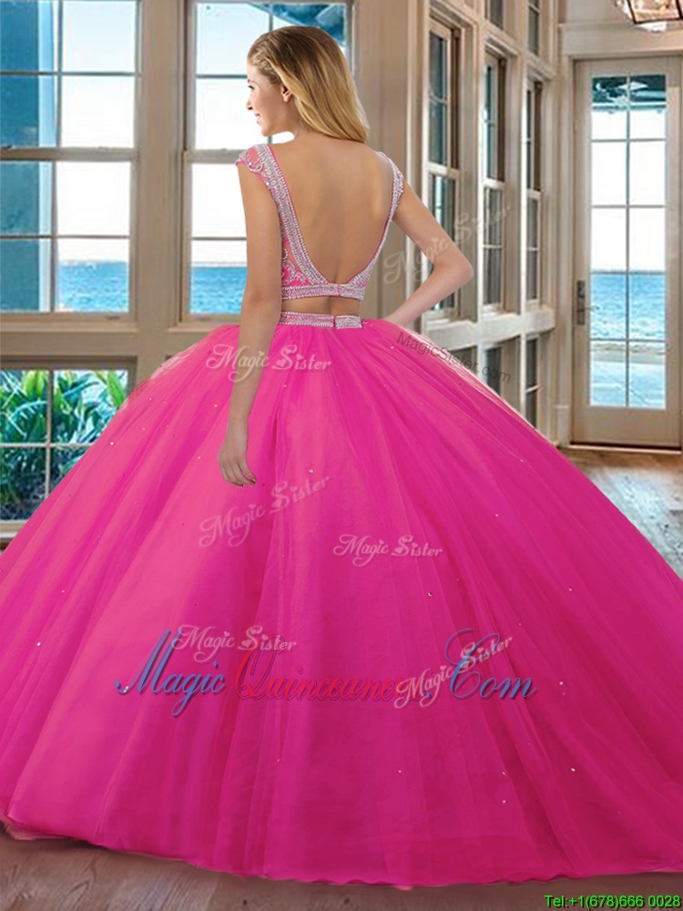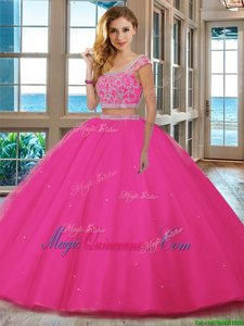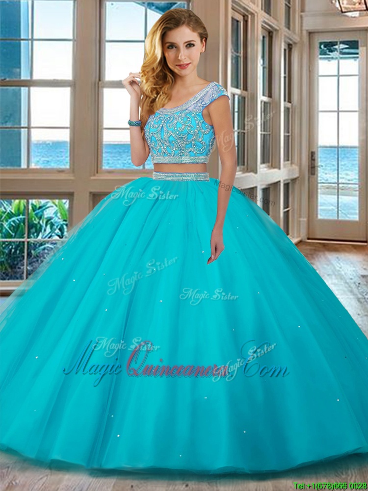 Fine Aqua Blue Tulle Backless Scoop Cap Sleeves Floor Length Sweet 16 Dresses Beading and Ruffles