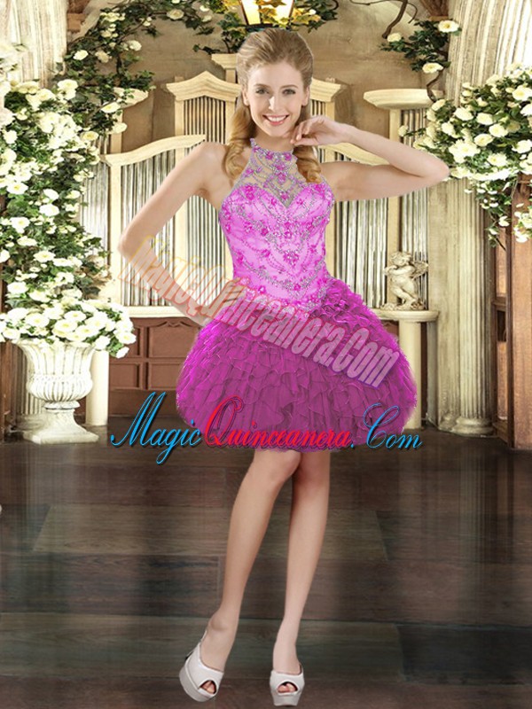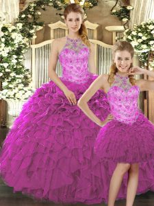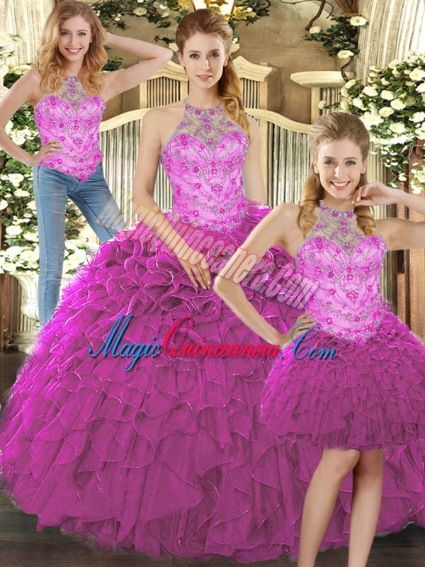 Fine Fuchsia Sleeveless Floor Length Beading and Ruffles Lace Up Vestidos de Quinceanera