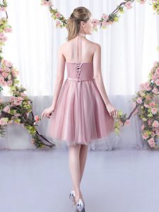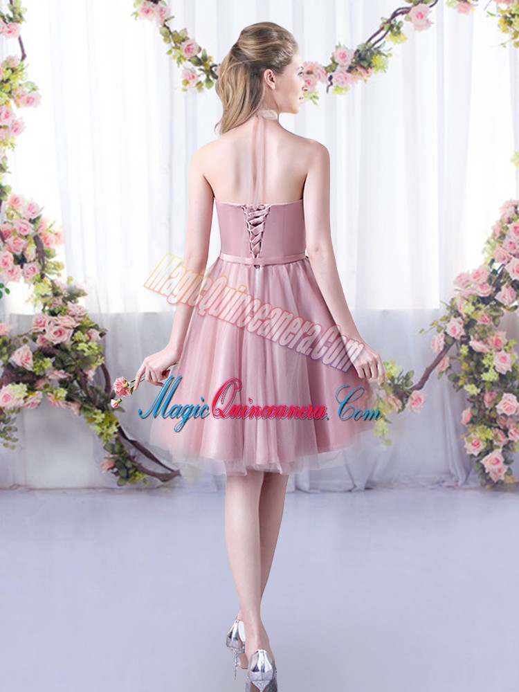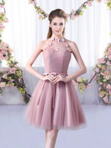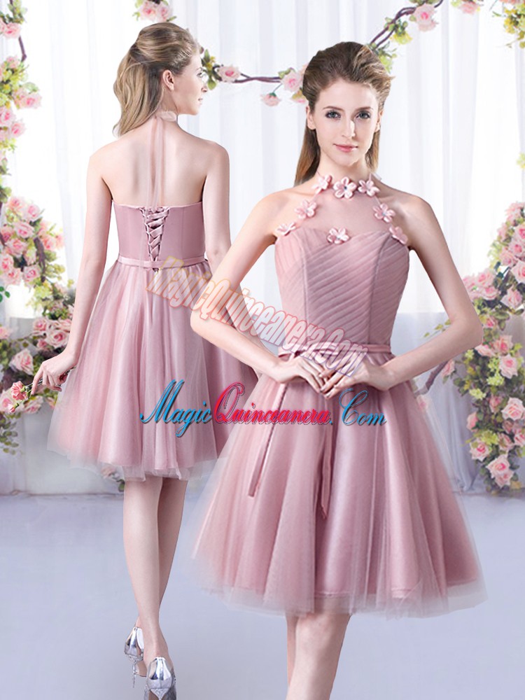 Fine Sleeveless Lace Up Knee Length Appliques and Belt Dama Dress for Quinceanera