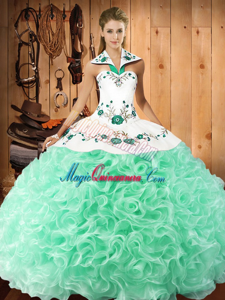 Fitting Apple Green Fabric With Rolling Flowers Lace Up 15 Quinceanera Dress Sleeveless Floor Length Embroidery