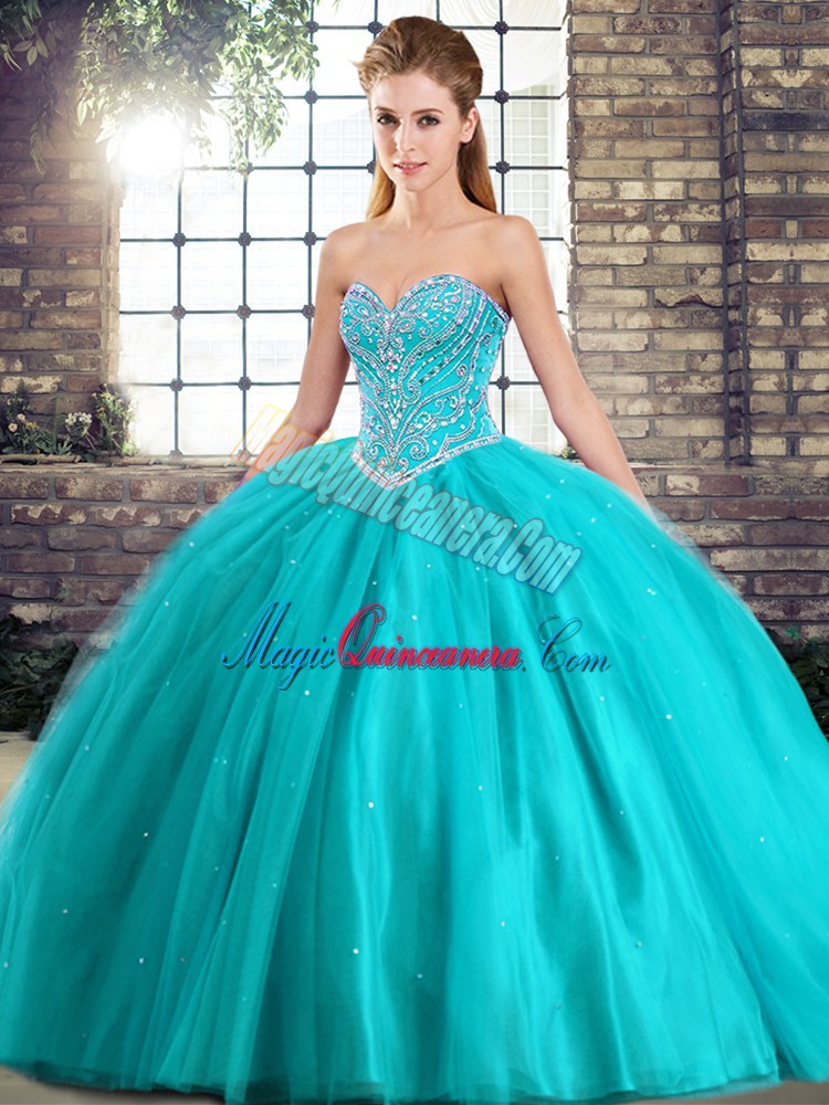 Fitting Aqua Blue Sleeveless Tulle Brush Train Lace Up Quince Ball Gowns for Military Ball and Sweet 16 and Quinceanera