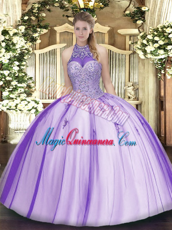 , Fitting Floor Length Lavender Vestidos de Quinceanera Halter Top Sleeveless Lace Up