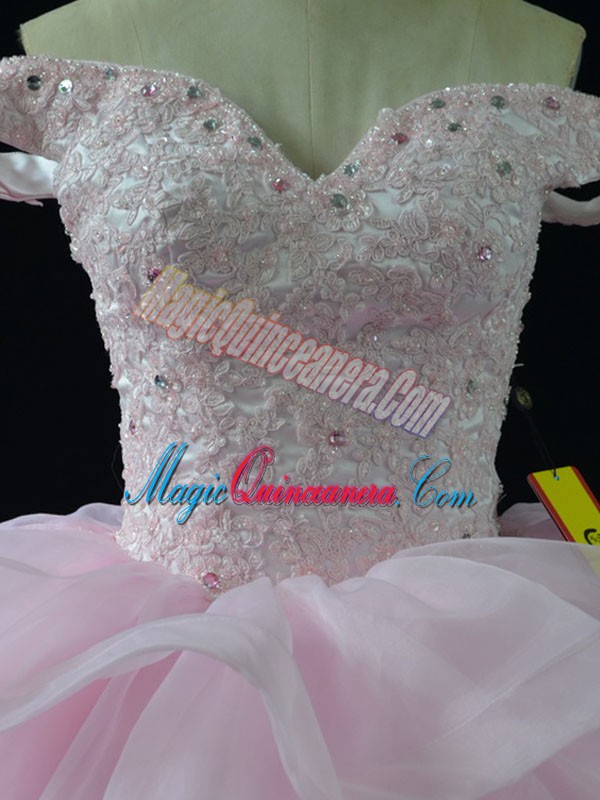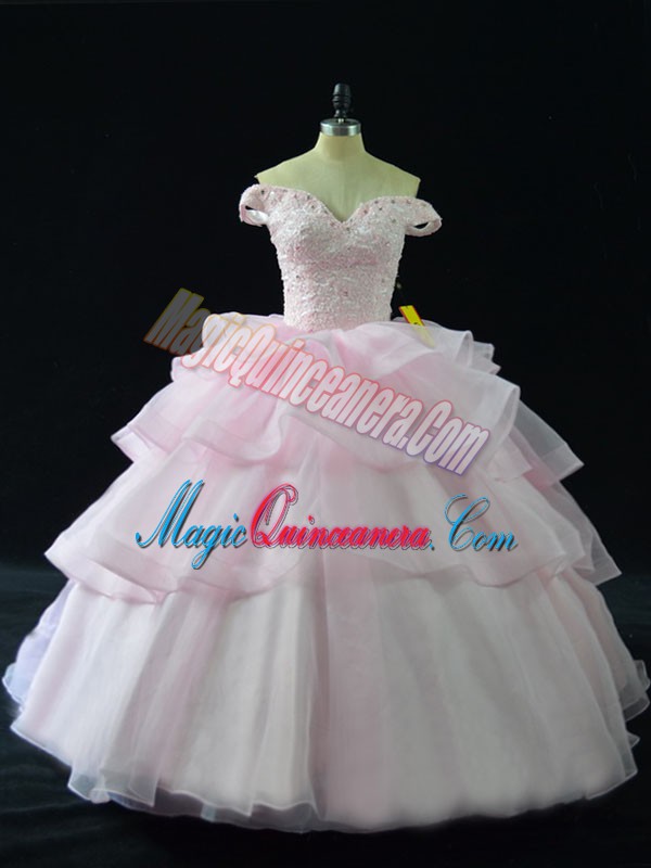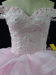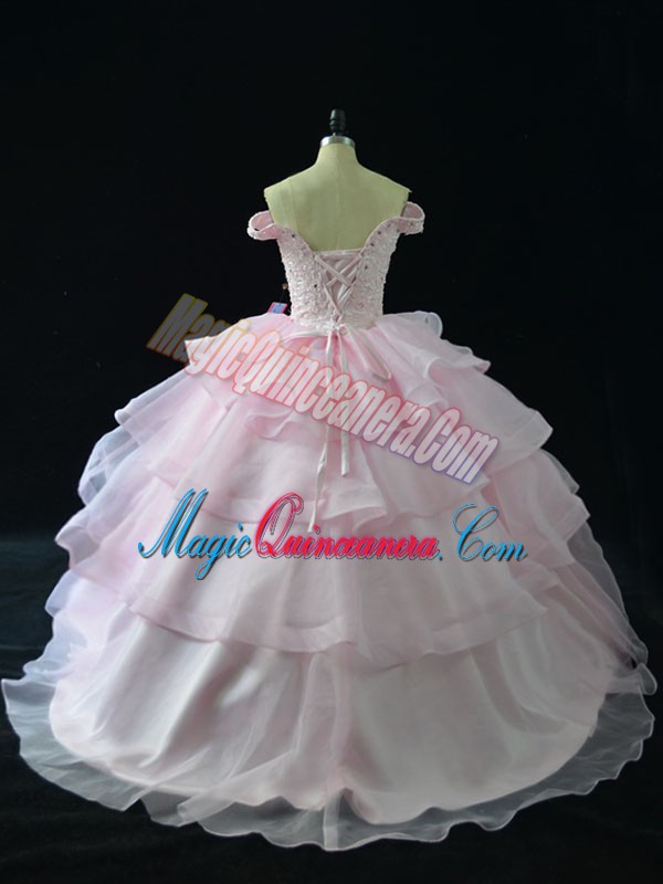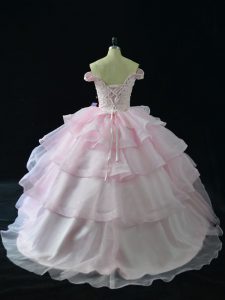Fitting Pink Sleeveless Brush Train Beading and Ruffled Layers Ball Gown Prom Dress