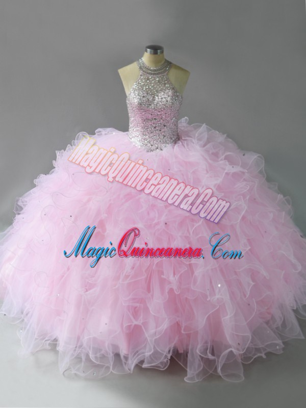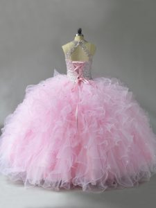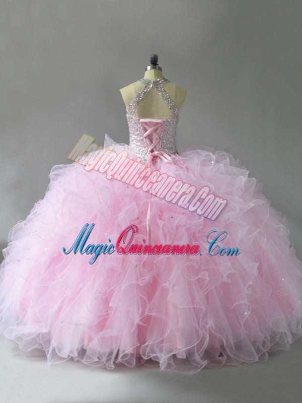 Fitting Pink Sleeveless Floor Length Beading and Ruffles Lace Up 15th Birthday Dress