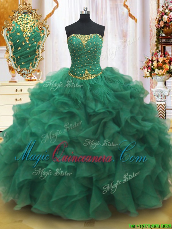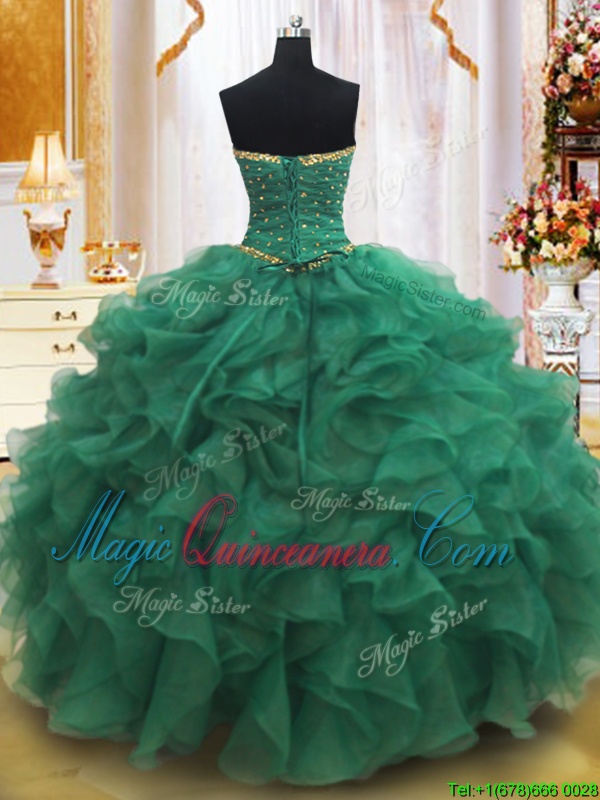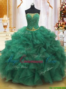 Fitting Sleeveless Floor Length Beading and Ruffles Lace Up Quinceanera Dresses with Dark Green