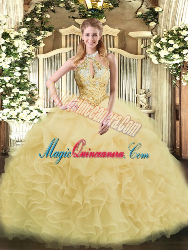 Flare Floor Length Lace Up Sweet 16 Quinceanera Dress Champagne for Military Ball and Sweet 16 and Quinceanera with Beading and Ruffles - Magic Quinceanera