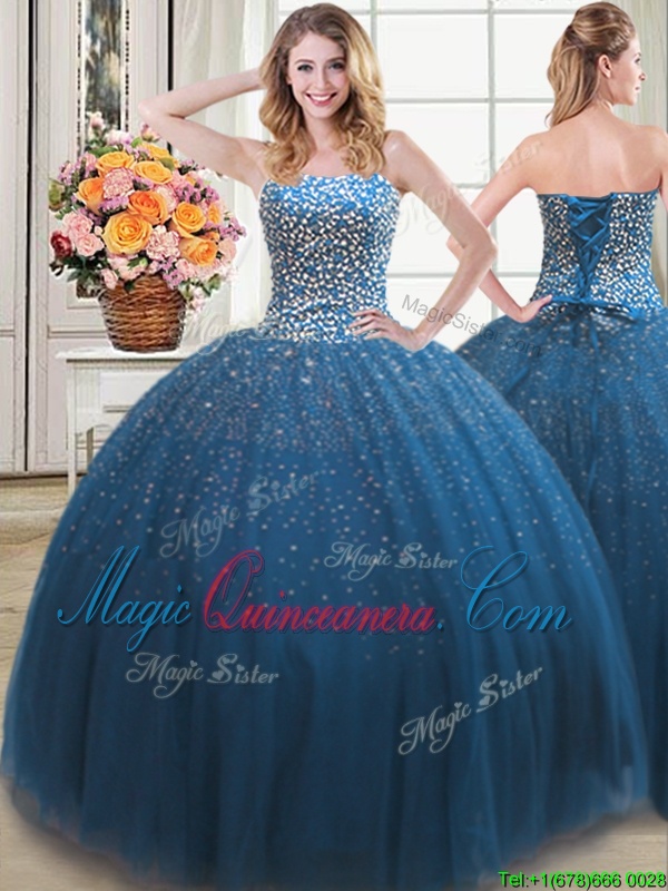 Flare Four Piece Teal Sleeveless Floor Length Beading Lace Up Vestidos de Quinceanera