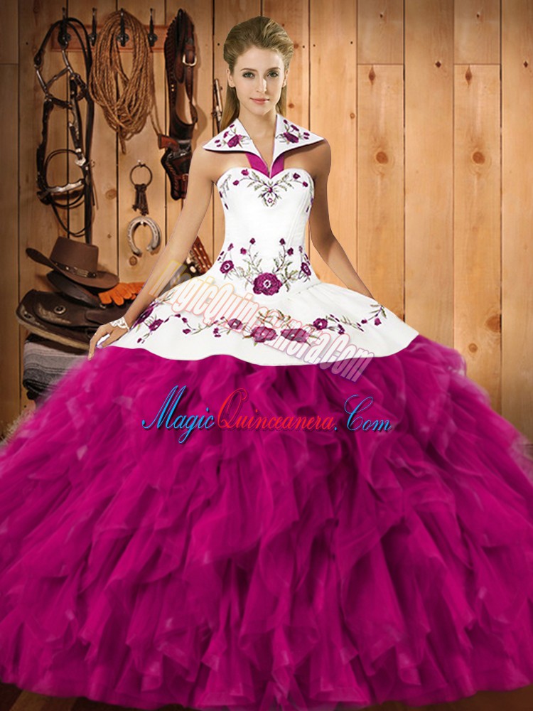 Flare Fuchsia Sleeveless Satin and Organza Lace Up Sweet 16 Quinceanera Dress for Military Ball and Sweet 16 and Quinceanera