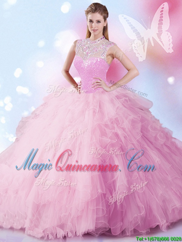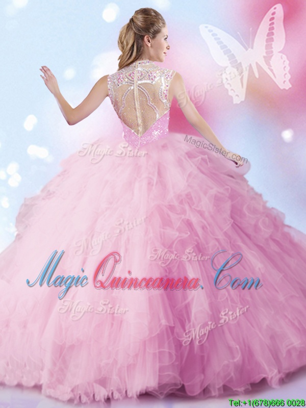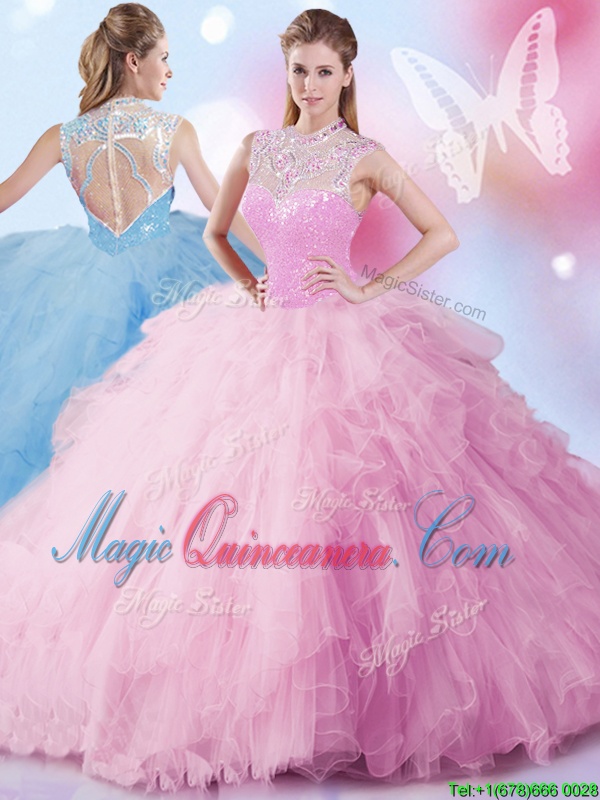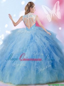 Flare High-neck Sleeveless Tulle Quinceanera Dresses Beading and Ruffles and Sequins Zipper