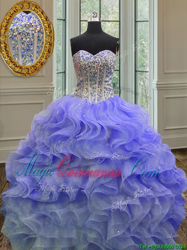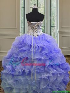 Flare Lavender Ball Gowns Organza Sweetheart Sleeveless Beading and Ruffles Floor Length Lace Up Vestidos de Quinceanera