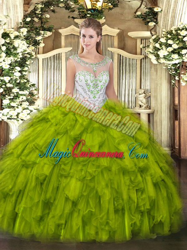 Flare Sleeveless Floor Length Beading and Ruffles Zipper Quinceanera Gowns with Olive Green