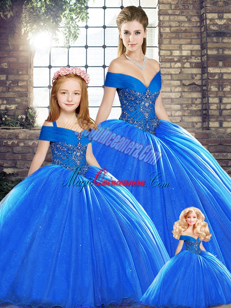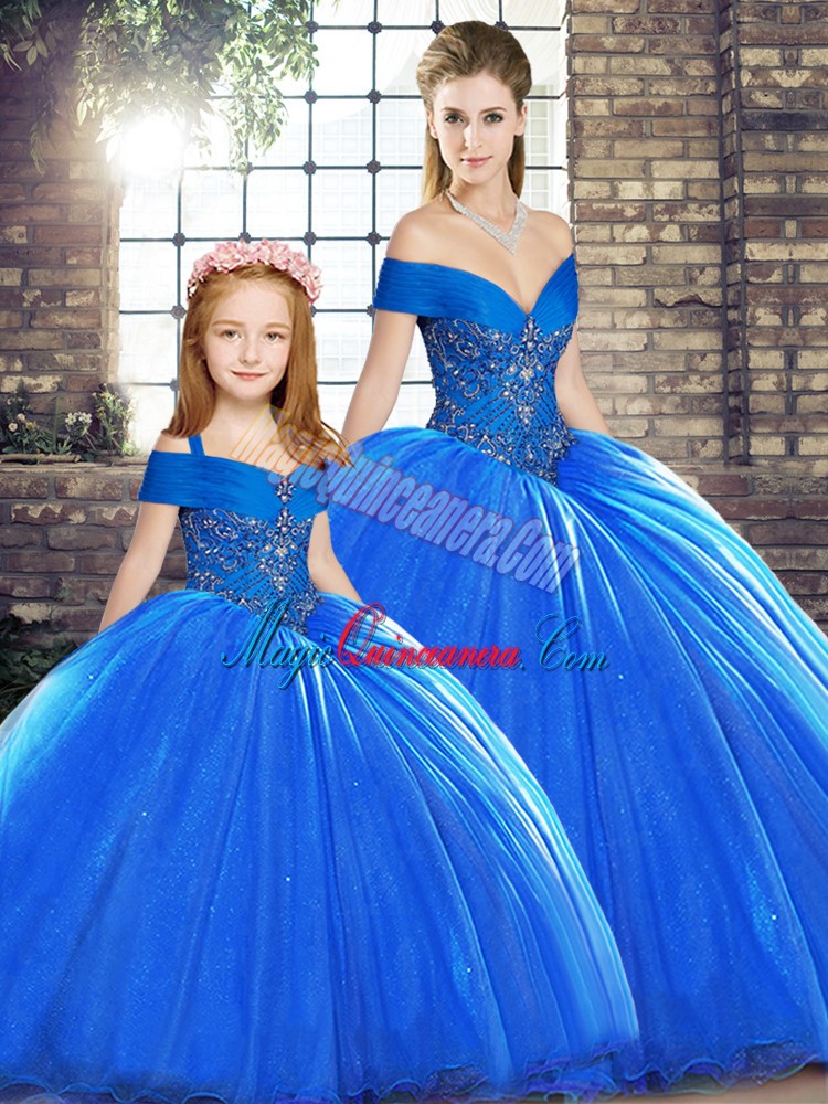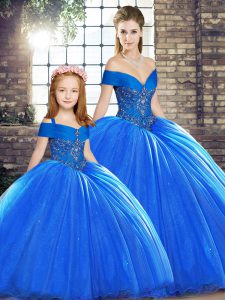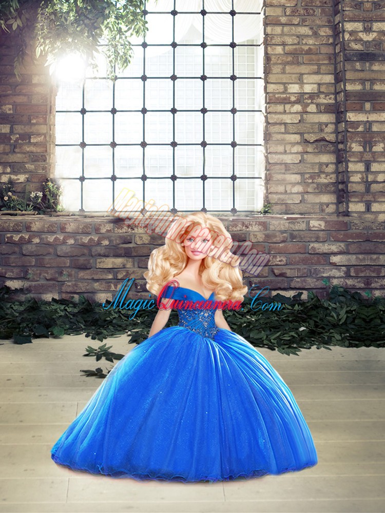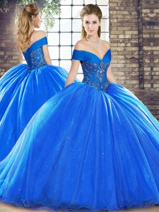 Flirting Off The Shoulder Sleeveless Sweet 16 Dress Brush Train Beading Royal Blue Organza