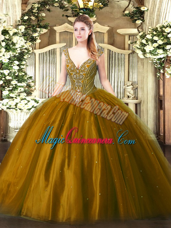 , Flirting Sleeveless Floor Length Beading Lace Up Quinceanera Dresses with Brown