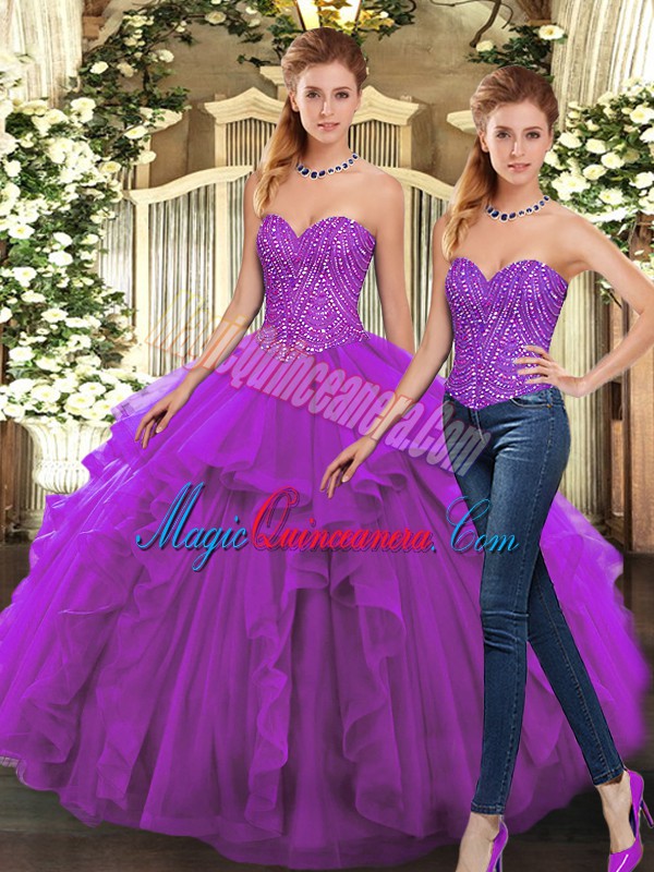 Flirting Sleeveless Organza Floor Length Lace Up Sweet 16 Quinceanera Dress in Purple with Beading and Ruffles