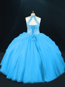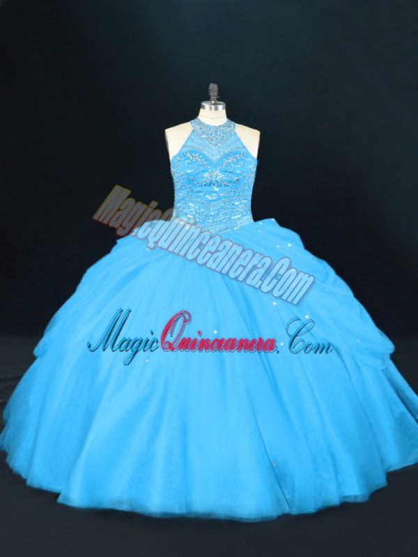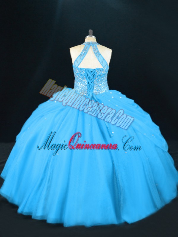 Floor Length Aqua Blue Ball Gown Prom Dress Halter Top Sleeveless Lace Up
