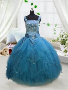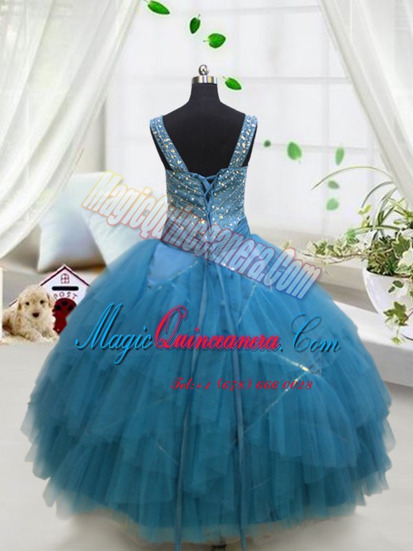 Floor Length Aqua Blue Evening Gowns Straps Sleeveless Lace Up