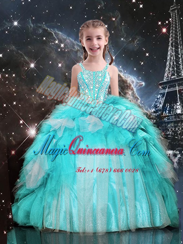 , Floor Length Ball Gowns Sleeveless Aqua Blue Little Girl Pageant Dress Lace Up