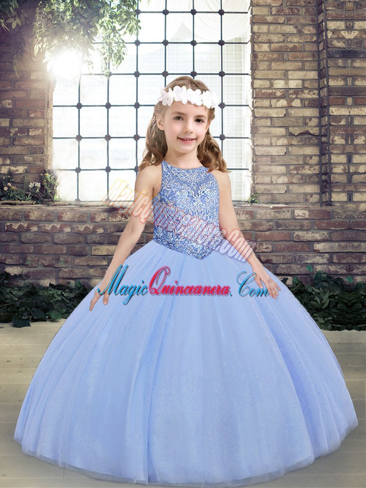 Floor Length Ball Gowns Sleeveless Light Blue Little Girls Pageant Gowns Lace Up