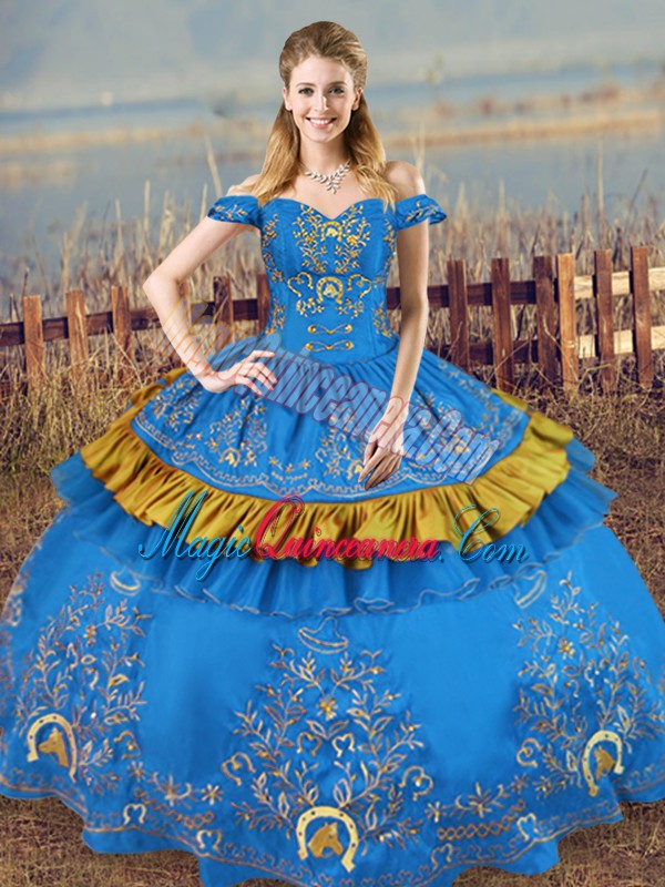 , Floor Length Blue 15 Quinceanera Dress Off The Shoulder Sleeveless Lace Up