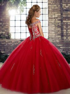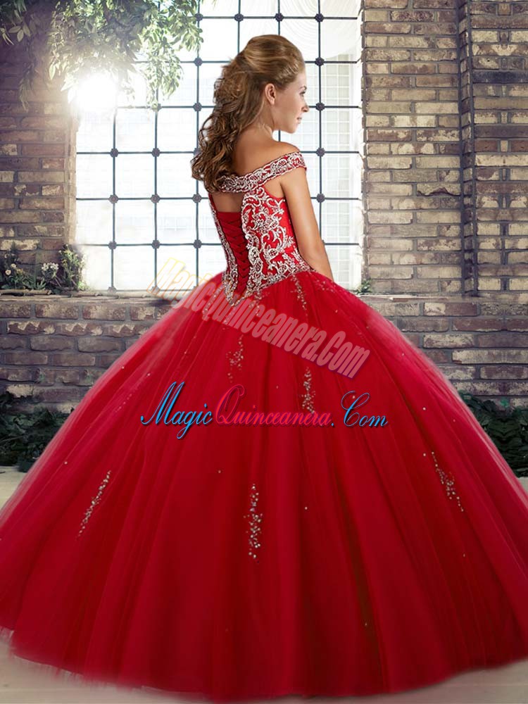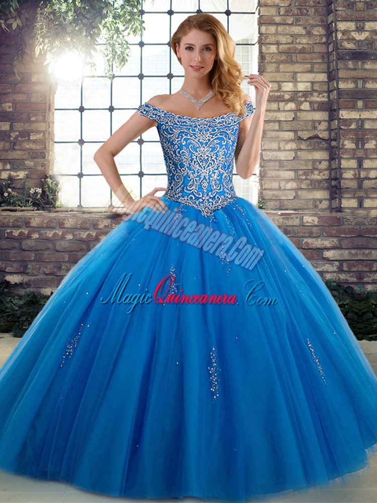 , Floor Length Blue Quinceanera Gown Tulle Sleeveless Beading