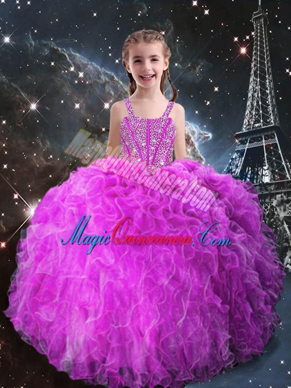 , Floor Length Fuchsia Pageant Dress for Teens Organza Sleeveless Beading and Ruffles