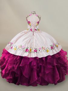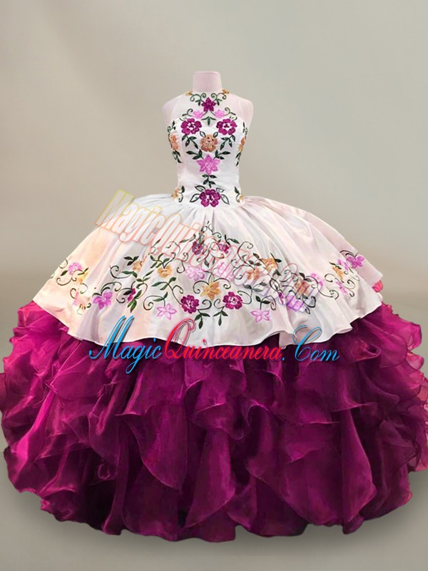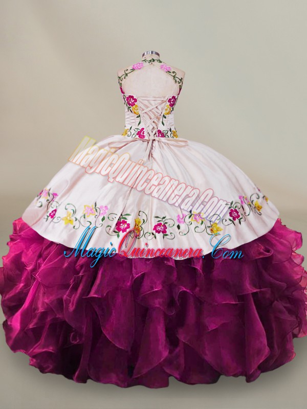 , Floor Length Fuchsia Quince Ball Gowns Organza Sleeveless Beading and Embroidery