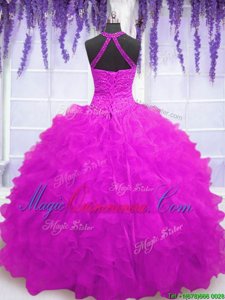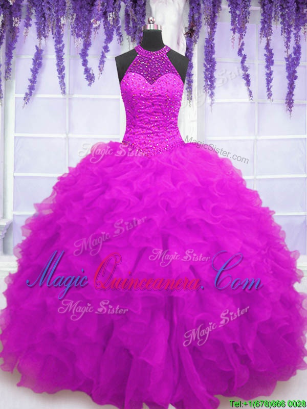 Floor Length Fuchsia Sweet 16 Dress High-neck Sleeveless Lace Up