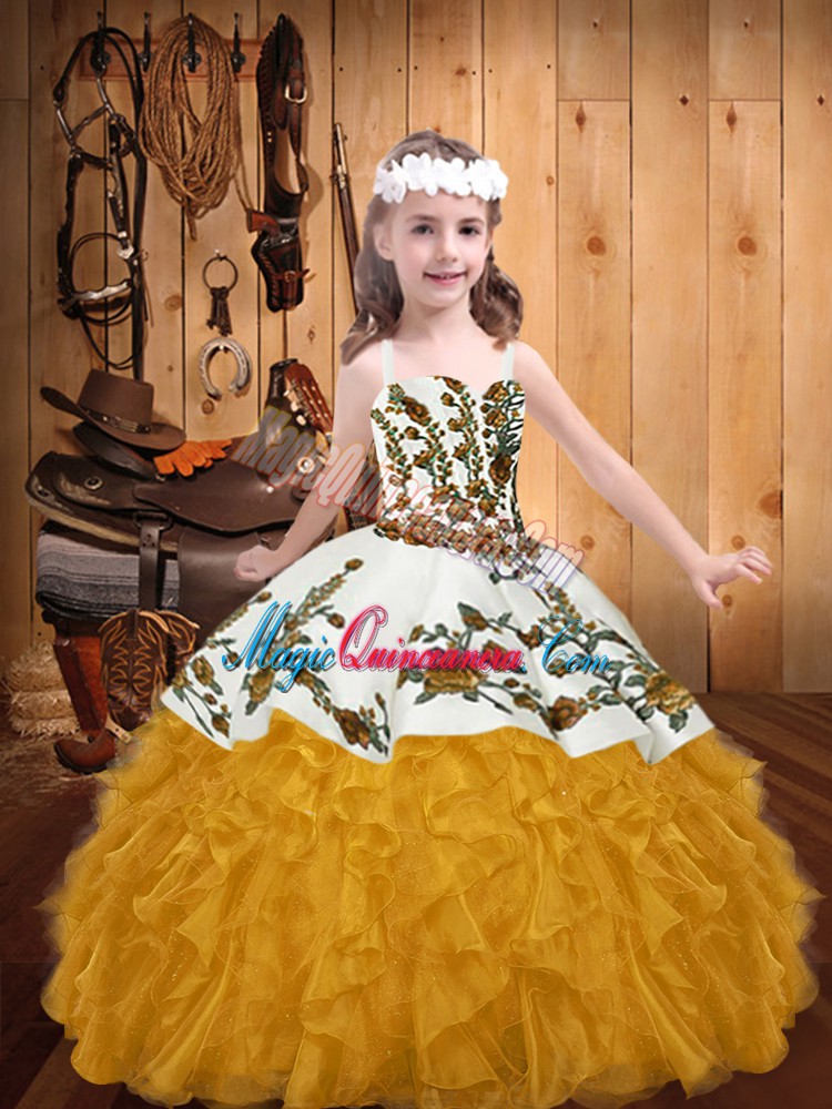 , Floor Length Gold Pageant Dresses Organza Sleeveless Embroidery and Ruffles