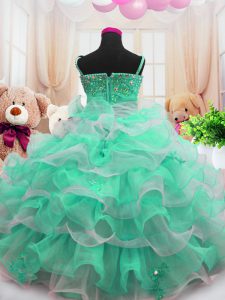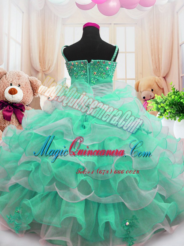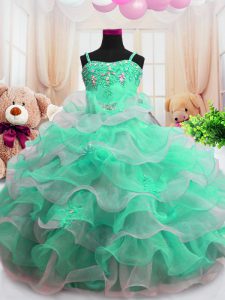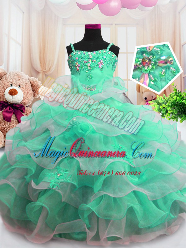 Floor Length Green Pageant Dress for Teens Organza Sleeveless Beading and Ruffled Layers