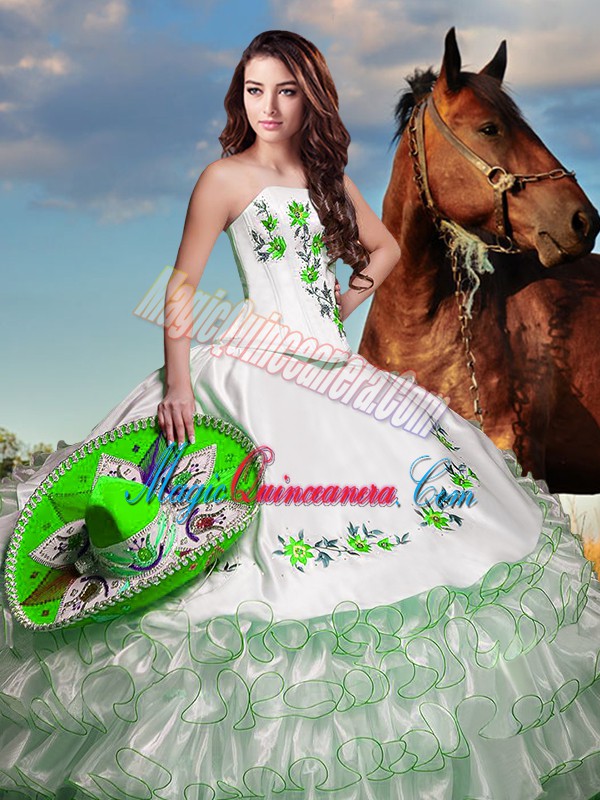 Floor Length Lace Up 15th Birthday Dress White for Military Ball and Sweet 16 and Quinceanera with Embroidery and Ruffled Layers