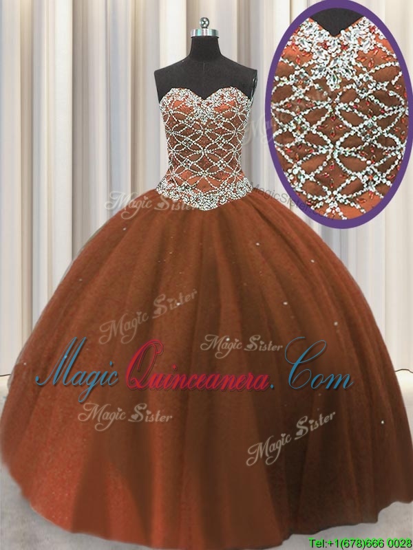 Floor Length Lace Up Ball Gown Prom Dress Brown and In for Military Ball and Sweet 16 and Quinceanera with Beading and Sequins