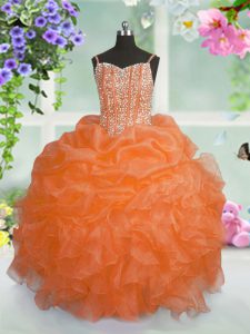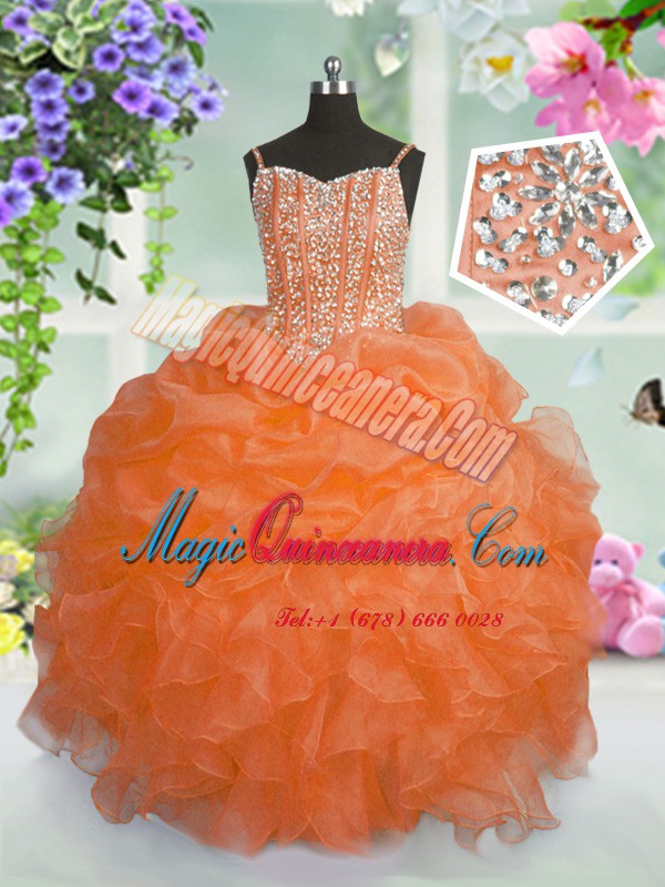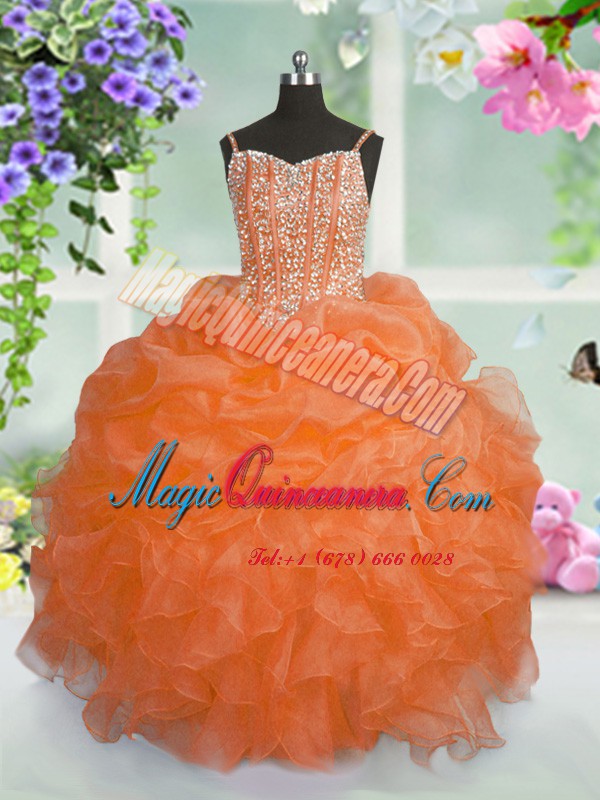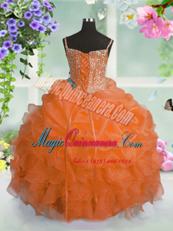 , Floor Length Lace Up Custom Made Pageant Dress Orange for Party and Wedding Party with Beading and Ruffles and Pick Ups