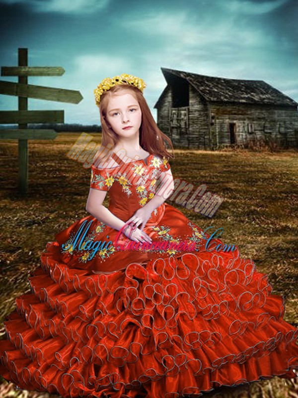 Floor Length Lace Up Girls Pageant Dresses Orange Red for Wedding Party with Embroidery and Ruffled Layers