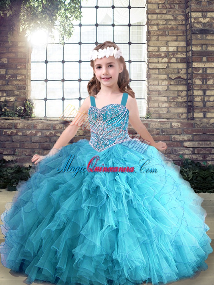 Floor Length Lace Up Pageant Dress for Girls Aqua Blue for Party and Wedding Party with Beading and Ruffles