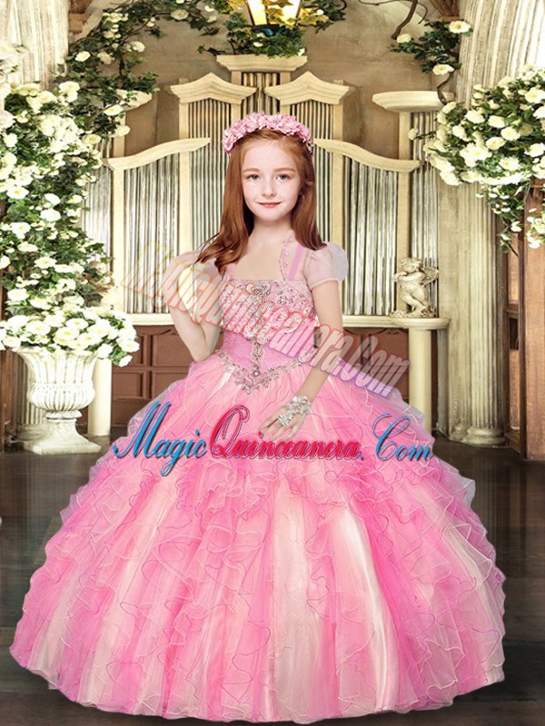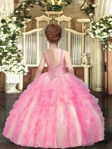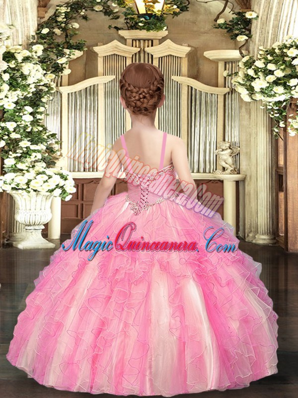 Floor Length Lace Up Pageant Dress for Girls Baby Pink for Party and Wedding Party with Beading and Ruffles